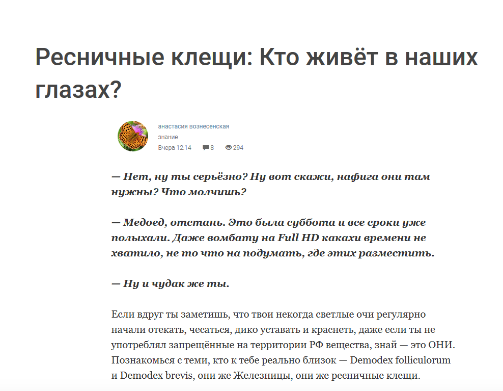 Несмотря на то, что эта тема обсуждается из года в год, многие люди до сих пор не знают, как реагировать на укус клеща и что делать. Врач-терапевт клиники АО «Медицина» (клиника академика Ройтберга) Олеся Савельева рассказала о наиболее распространенных мифах, связанных с укусом клещей: "Многие твердо уверены в том, что вирус энцефалита переносят исключительно клещи – это далеко не так. Следует помнить, что болезнь переносят также мелкие животные, например, бурундуки, мыши, зайцы. Кроме того, переносчиками заболевания могут быть и домашние животные, укушенные клещами и птицы, например, дрозды, рябчики, скворцы, береговые ласточки и овсянки".